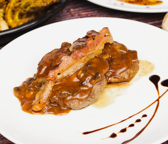 Medallones de centro de lomito fino con tocinetas en salsa de champiñones.