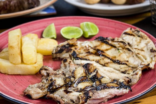 Porcion de pollo sin hueso a la brasa en salsa de limón.