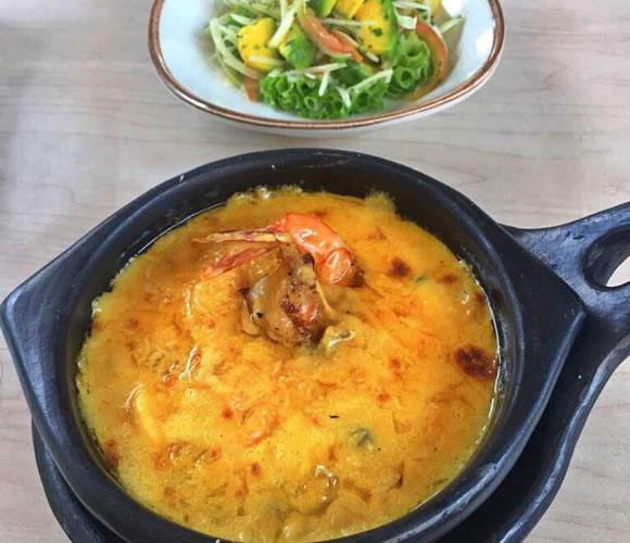 Crema marinera con cmarones, almeja, pulpo, calamar, pescado blanco y langostino.