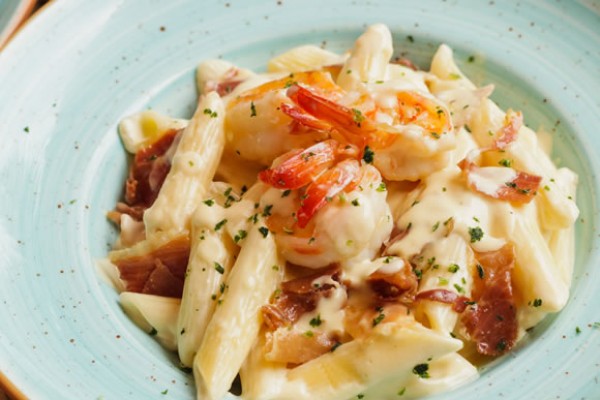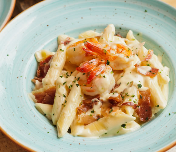 Con langostinos, jamon serrano, queso crema al vino blanco.