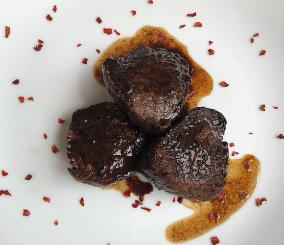 Lomo fino a las tres pimientas en reduccion de bourboun y vino tinto. Con arroz aromatizado en mantequilla de puerros.
