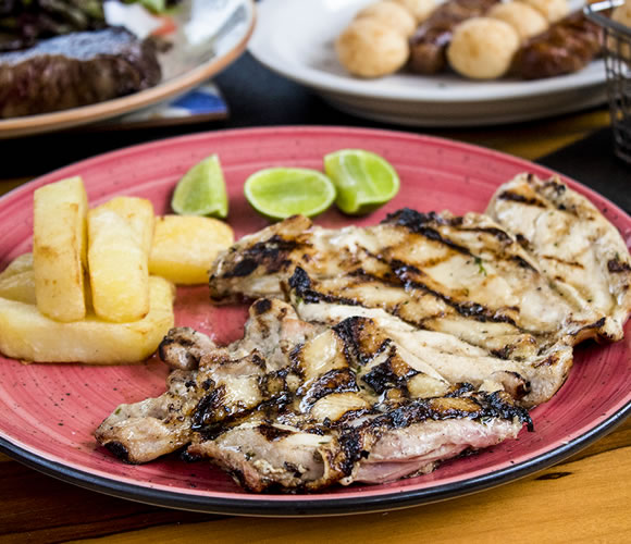 Porcion de pollo sin hueso a la brasa en salsa de limón.